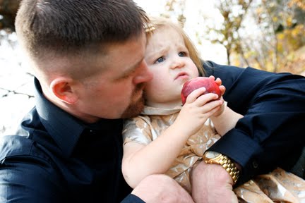 The Montgomery girls love apples. They were crazy about them last fall when I saw them. And just like a tractor beam, another tree with red, juicy apples, sucked them in this year. Lainey was quick to pull one off, lick it (to clean it of course!), and devour it. I think she may have taken one for the ride home too. As for her little sister Jesa, most of her time was spent peeling off red peeling with her teeth and spitting it out. Her mom says she finds them all over the house when she's given an apple. Better than a Snicker's wrapper, right? :)